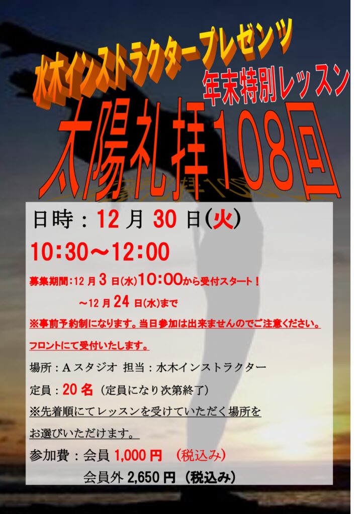 詳細は館内掲示、もしくは『年末特別レッスン(太陽礼拝)のご案内(PDF)』(ホームページお知らせ)をご覧ください。
