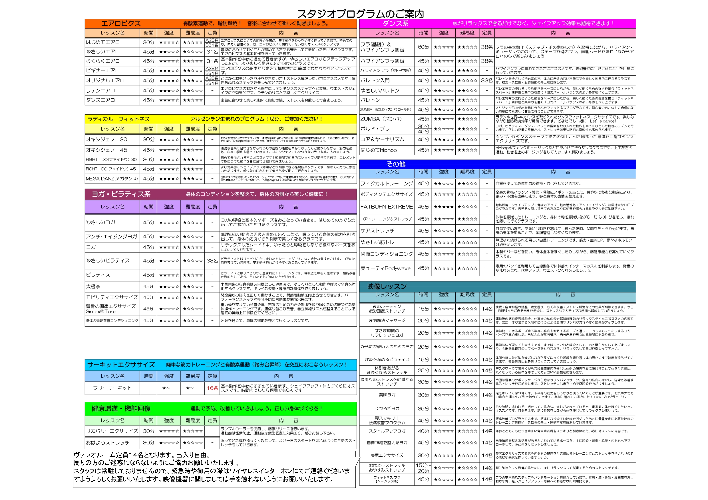 はじめてエアロ | エアロビクスについての効果や注意点、基本動作をわかりやすくおこなっていきます。初めての方、体力に自信のない方、エアロビクスに慣れていない方にオススメのクラスです。 |