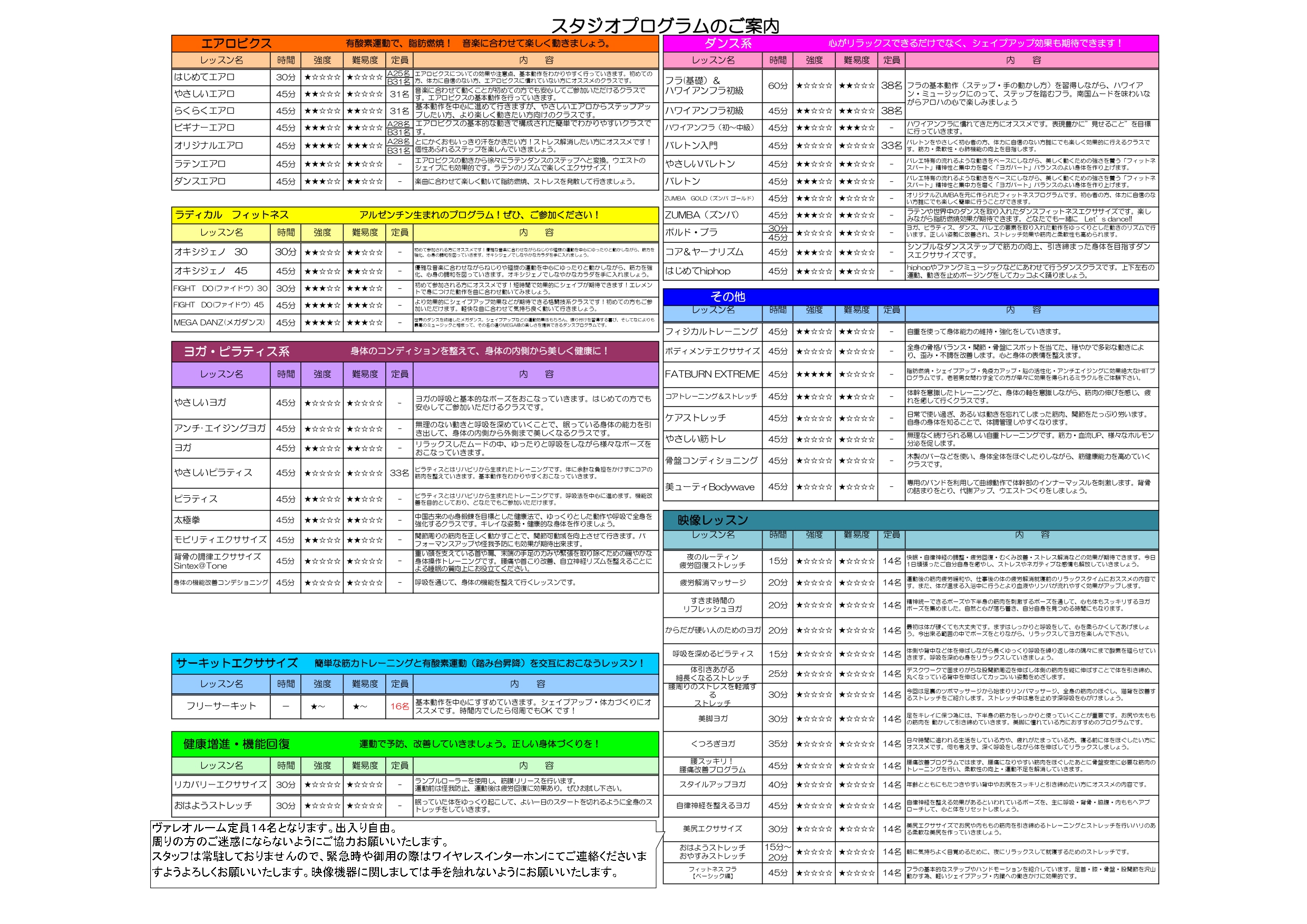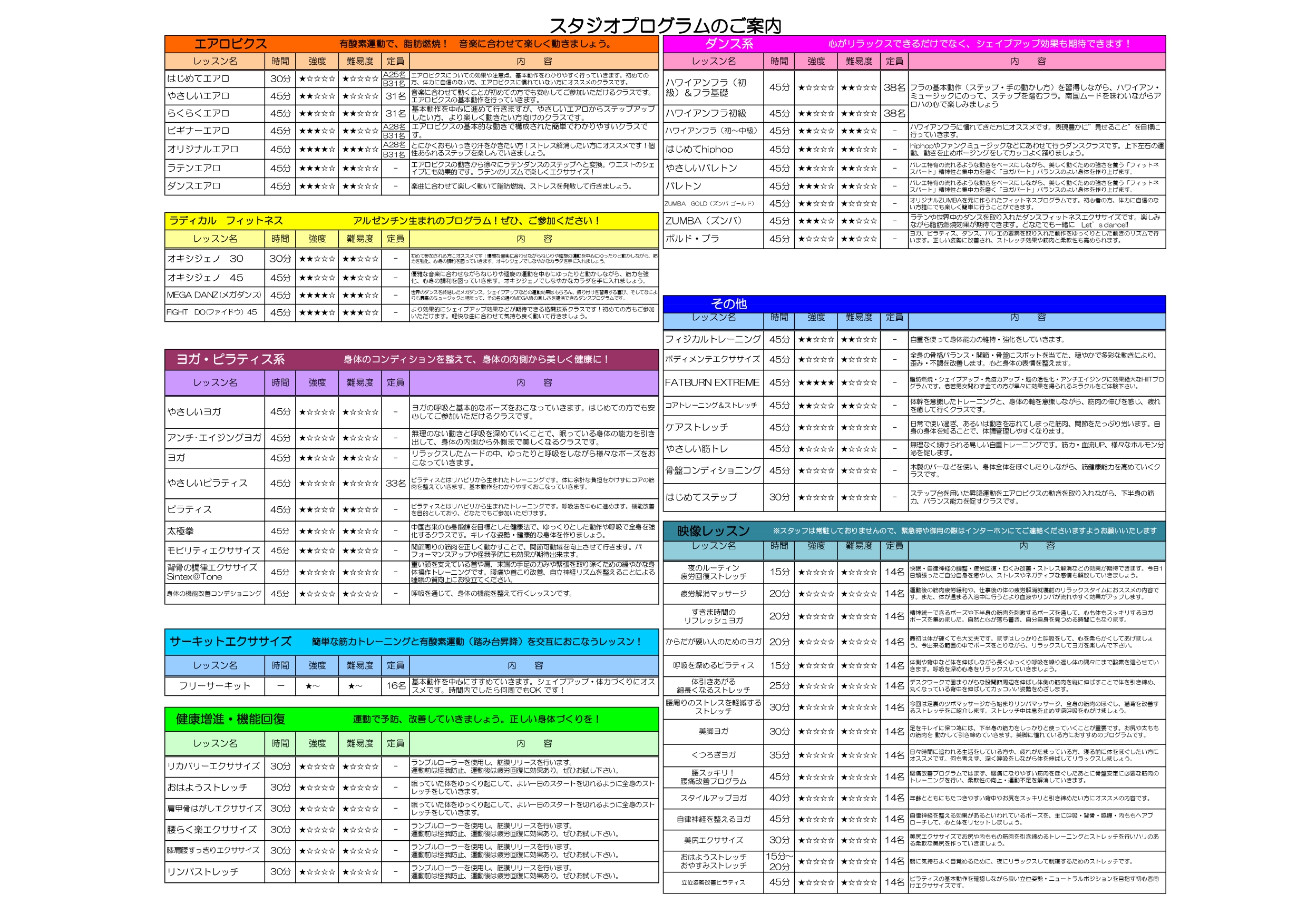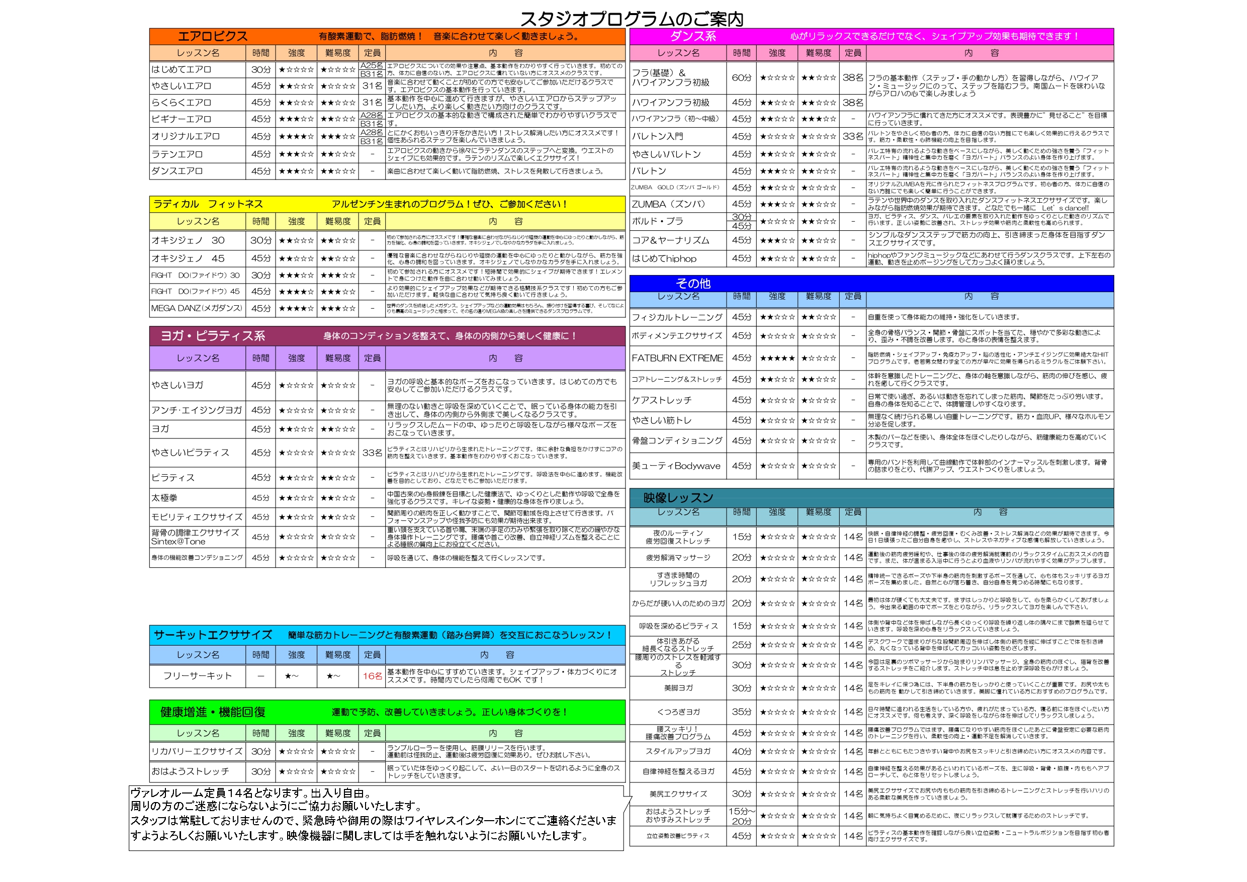 | はじめてエアロ | エアロビクスについての効果や注意点、基本動作をわかりやすくおこなっていきます。初めての方、体力に自信のない方、エアロビクスに慣れていない方にオススメのクラスです。 |